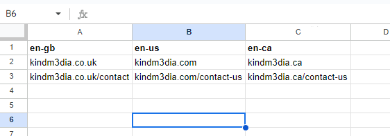 Obviously, in our example, we have fans in these three countries but you should include every language/region your site targets in this CSV file. You won’t always have/need an alternate URL in every different language but, when using the tool, each row must have an element for each country supplied.