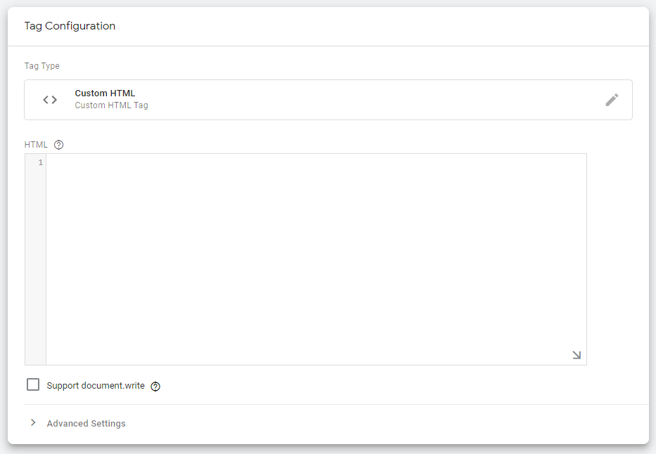 - Give your tag a name and select the “Custom HTML” option from Tag Configuration box